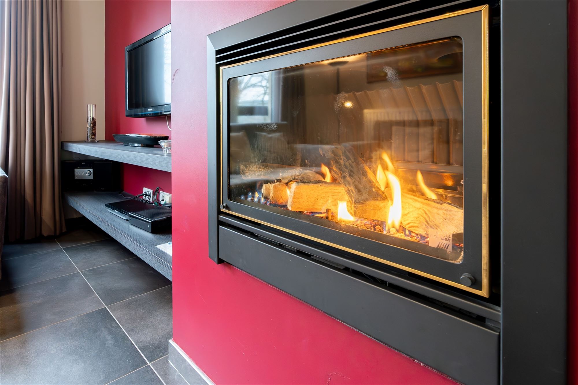 Une grande pièce à vivre baignée de lumière naturelle, agrémentée d’une cassette à gaz pour une ambiance chaleureuse.