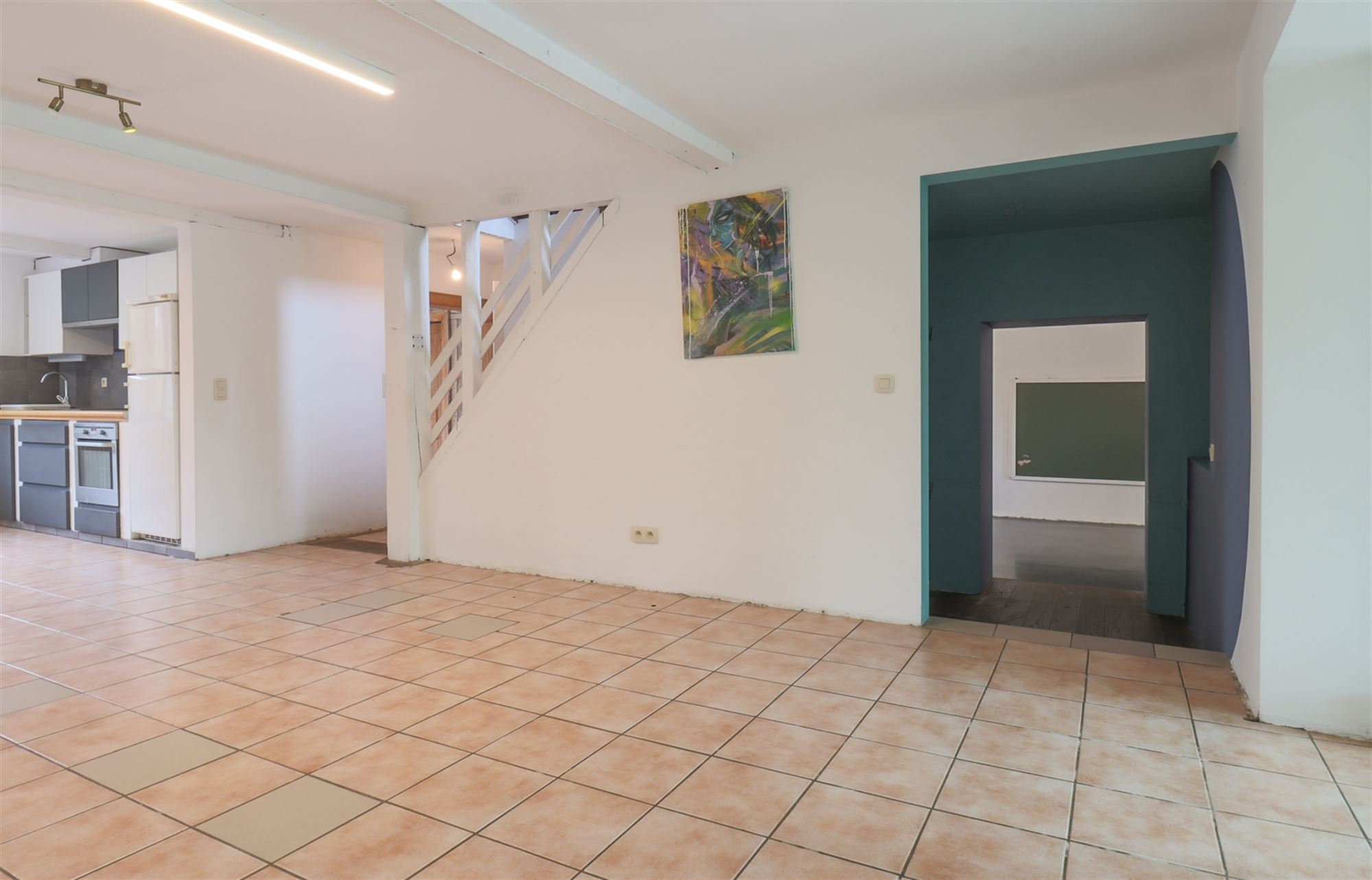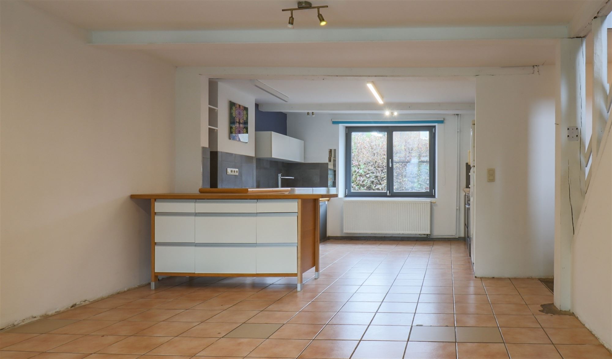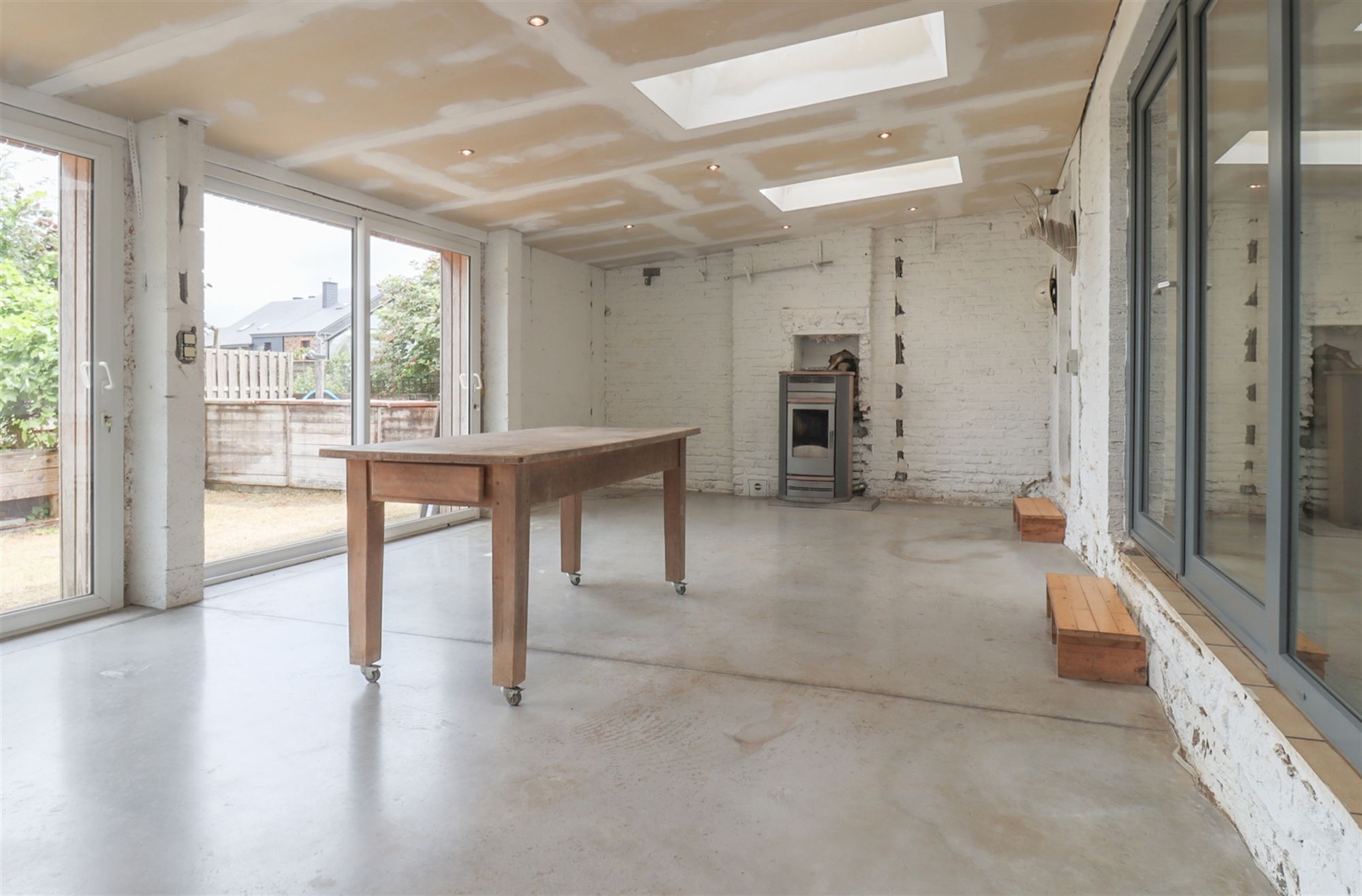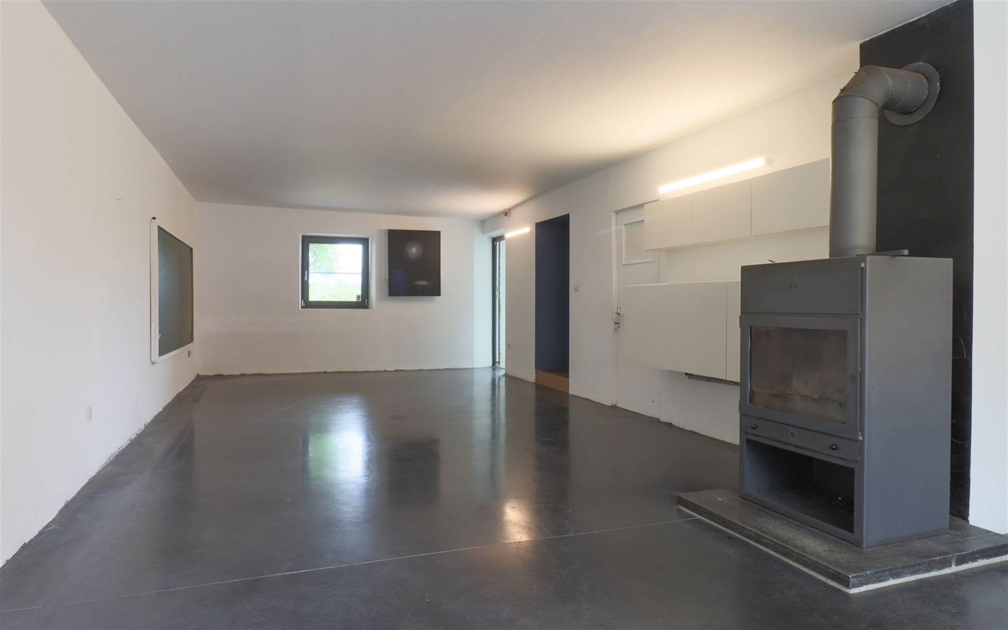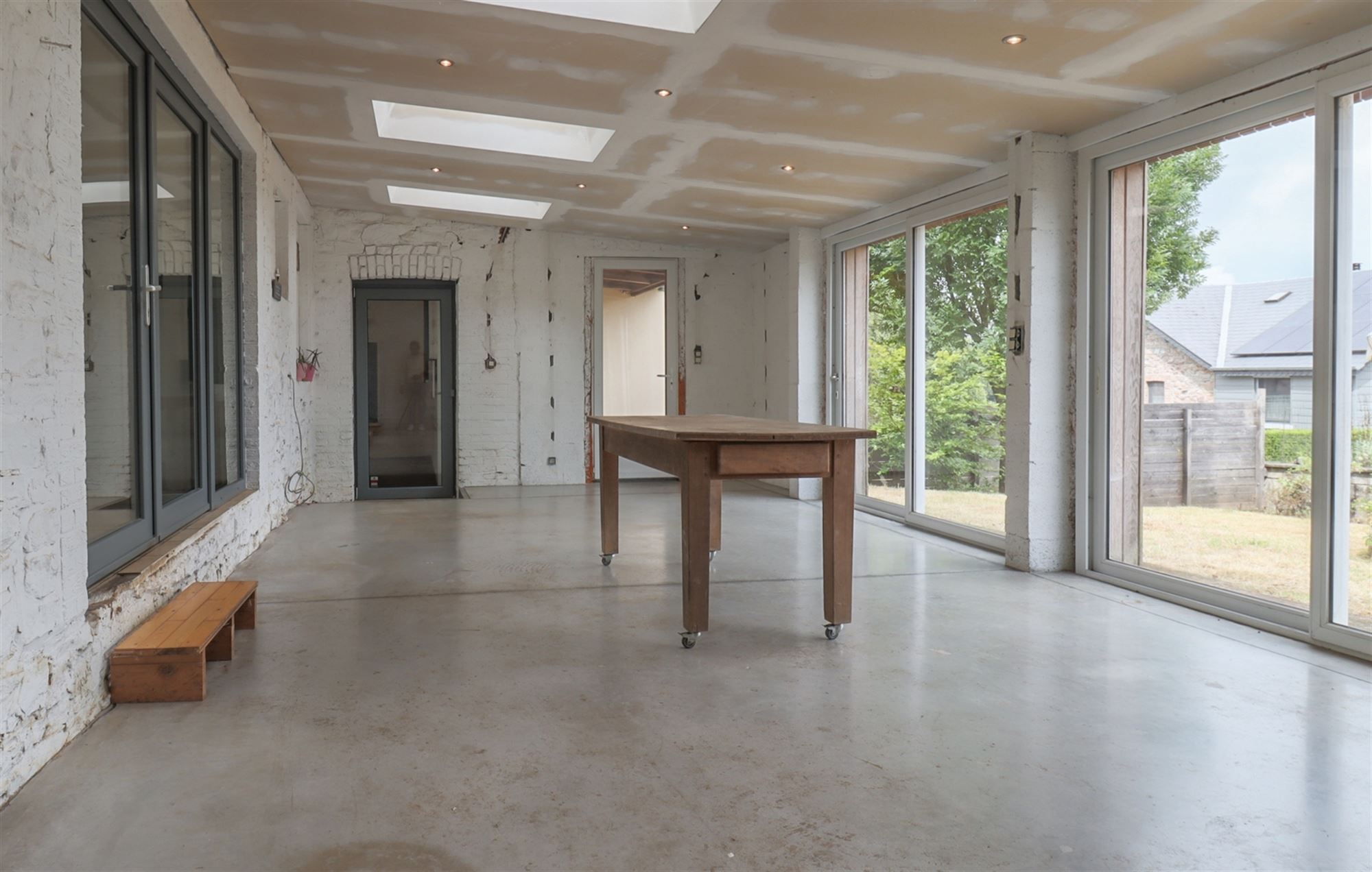 REZ : hall d'entrée avec WC séparé, salle à manger largement ouverte sur la cuisine et la véranda, spacieux séjour (sol en béton lissé), arrière cuisine/débarras, garage.