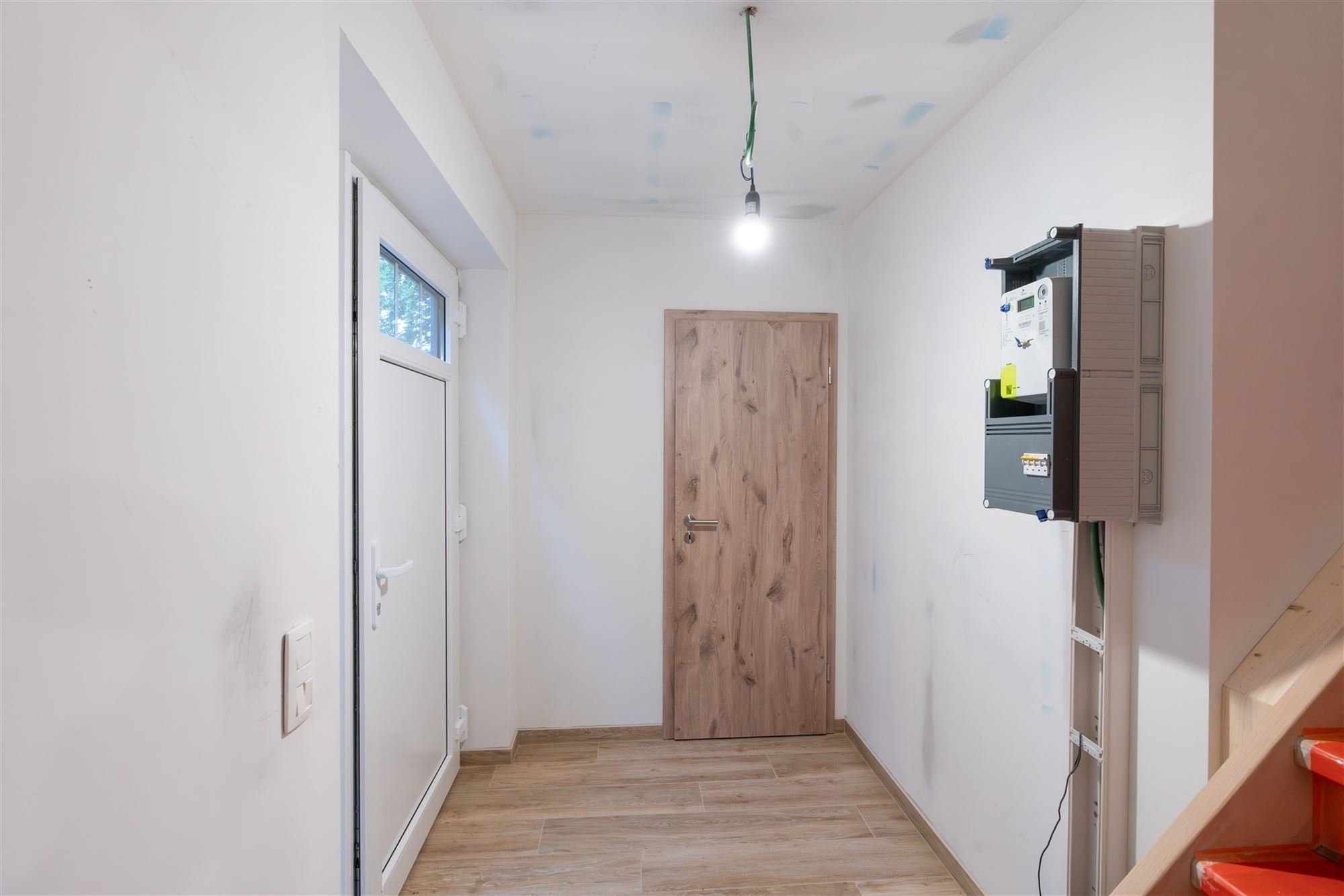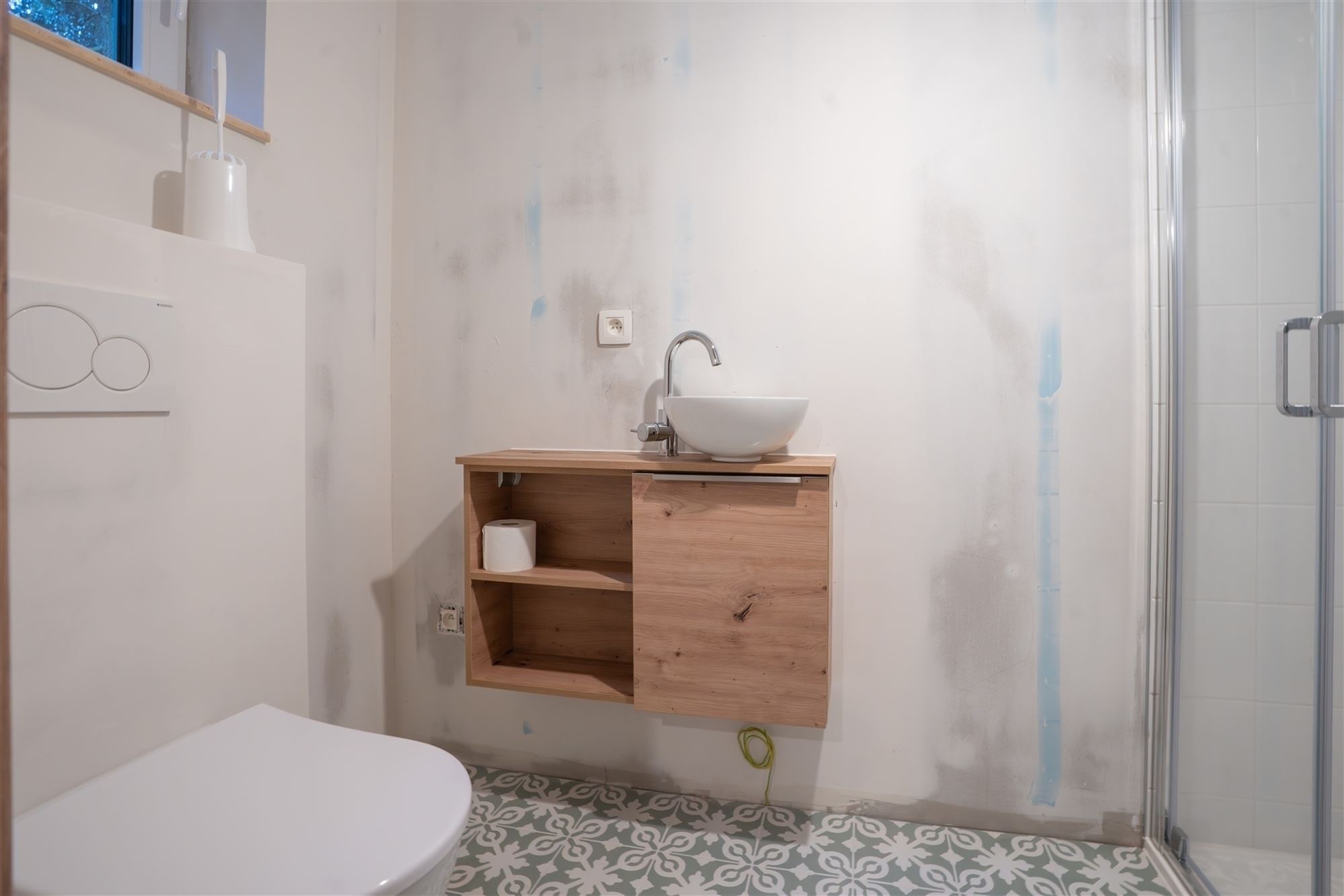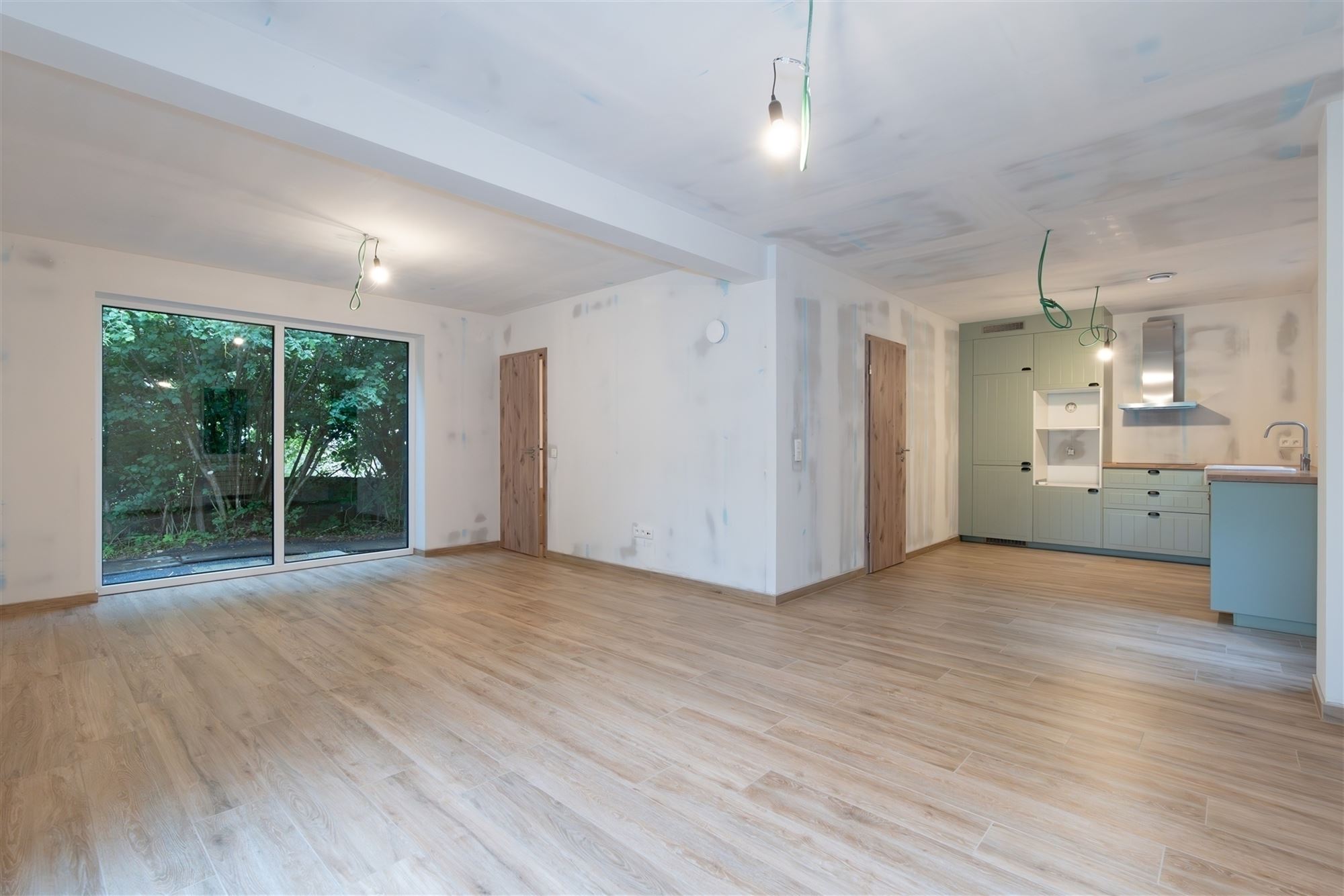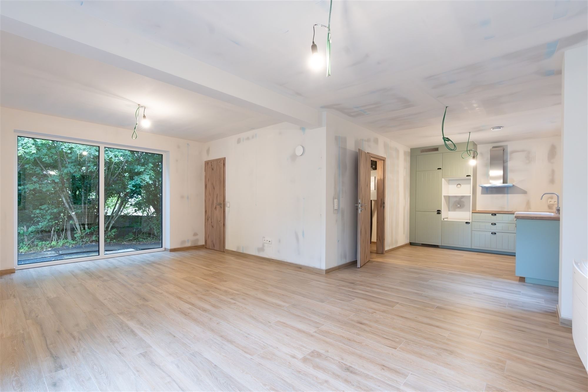 De gelijkvloerse verdieping biedt een ruime en lichte woonkamer met grote openingen naar de tuin, een gezellige open keuken, een praktische wasruimte en een doucheruimte met WC.