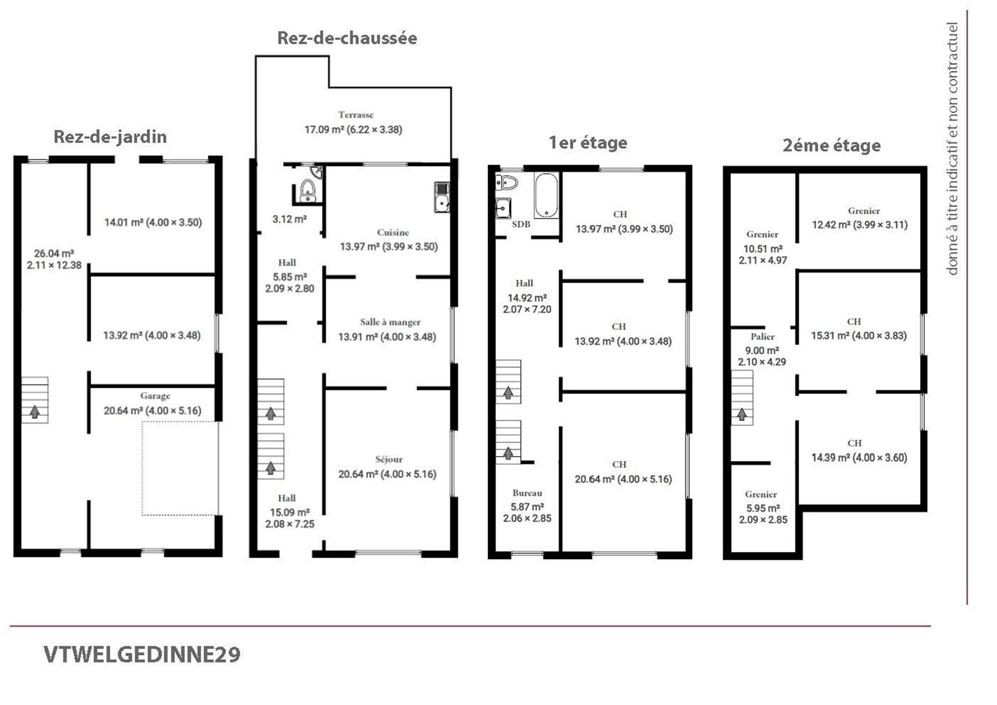 GLV+1: nachthal die 3 kamers bedient (20,64 m², 13,92 m² en 13,97 m²), een badkamer (bad, WC, wastafel) en een kantoorruimte die toegang biedt tot de tweede verdieping.