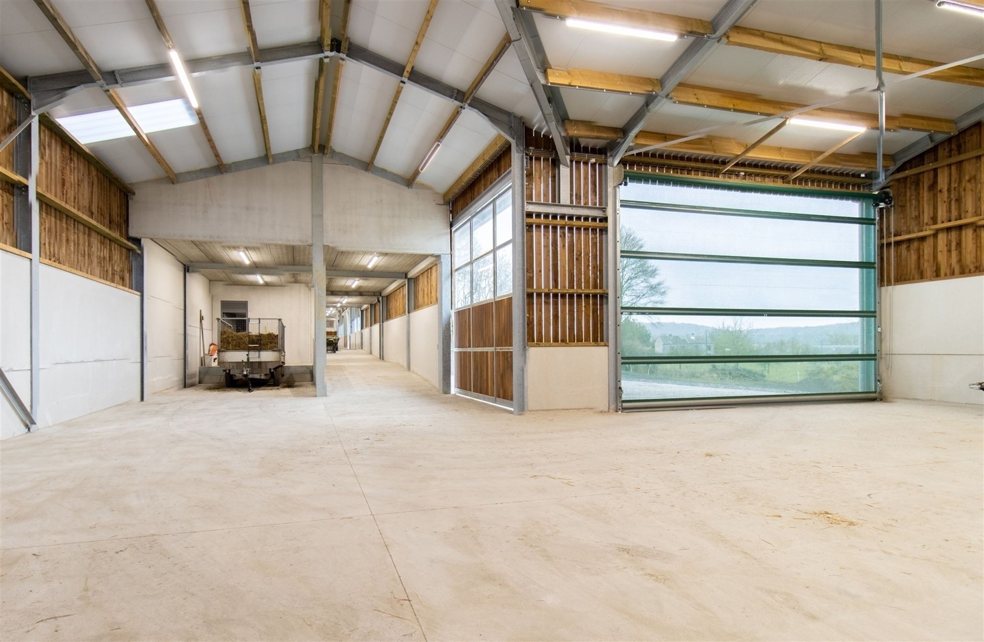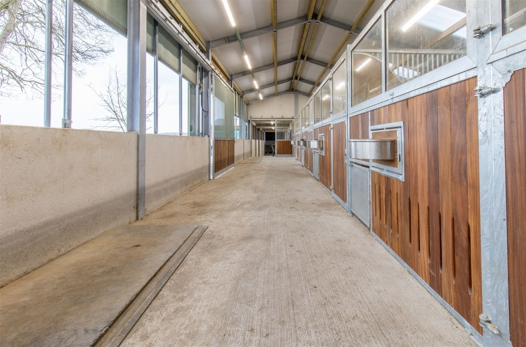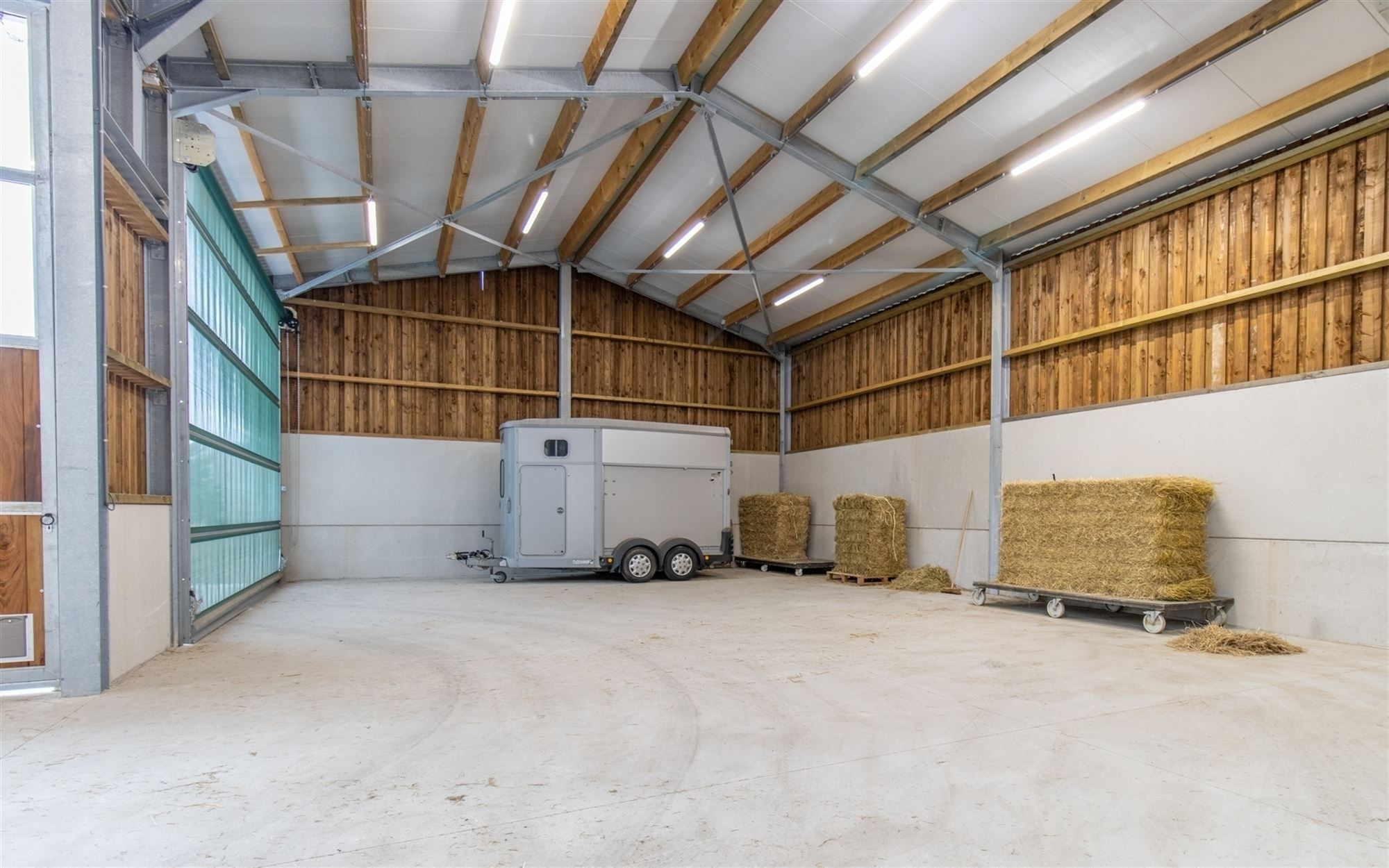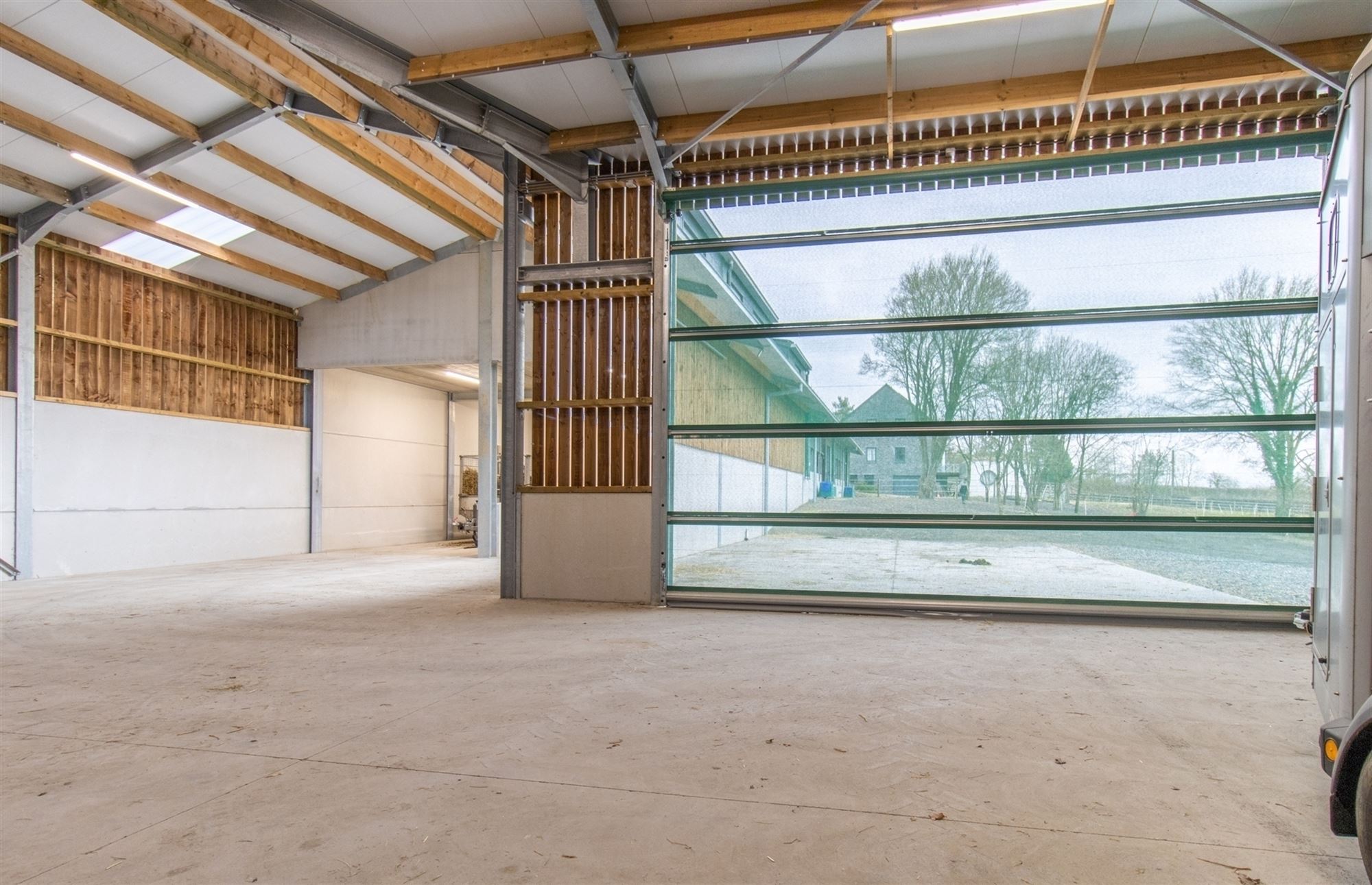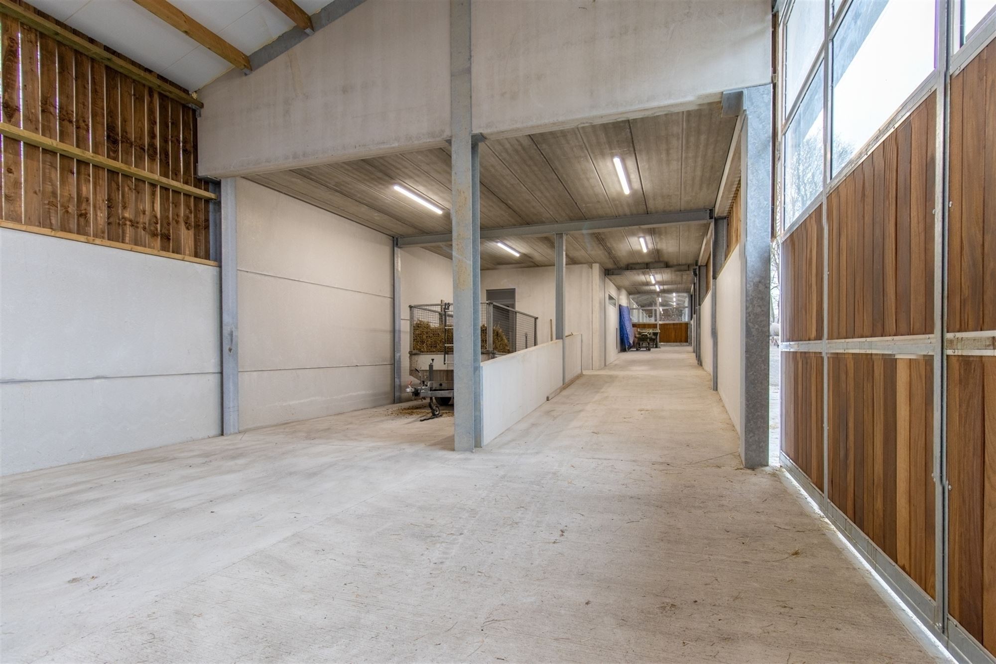 Hal met toegang tot het appartement links, opslagruimte/atelier en afzonderlijk toilet (nog te installeren), laadzone voor aanhangwagens (verhoogd voor comfortabel laden), opslagruimtes met een indrukwekkende hoogte (materialen, hooi, voertuigen … op 250 m²), over ongeveer 200 m²: brede gang voorzien van windbreek- en zonneschermen die momenteel 7 hoogwaardige boxen bedient.