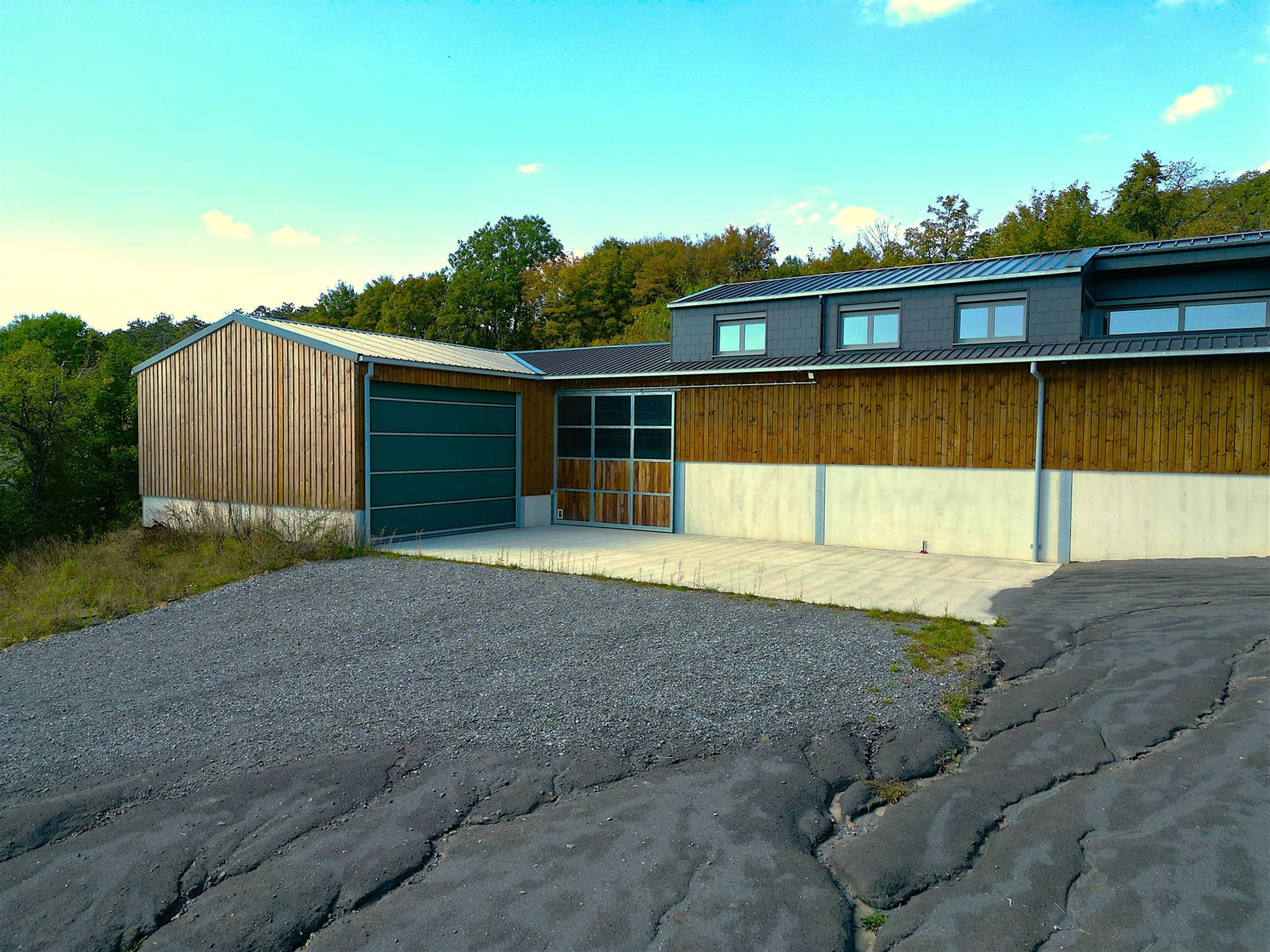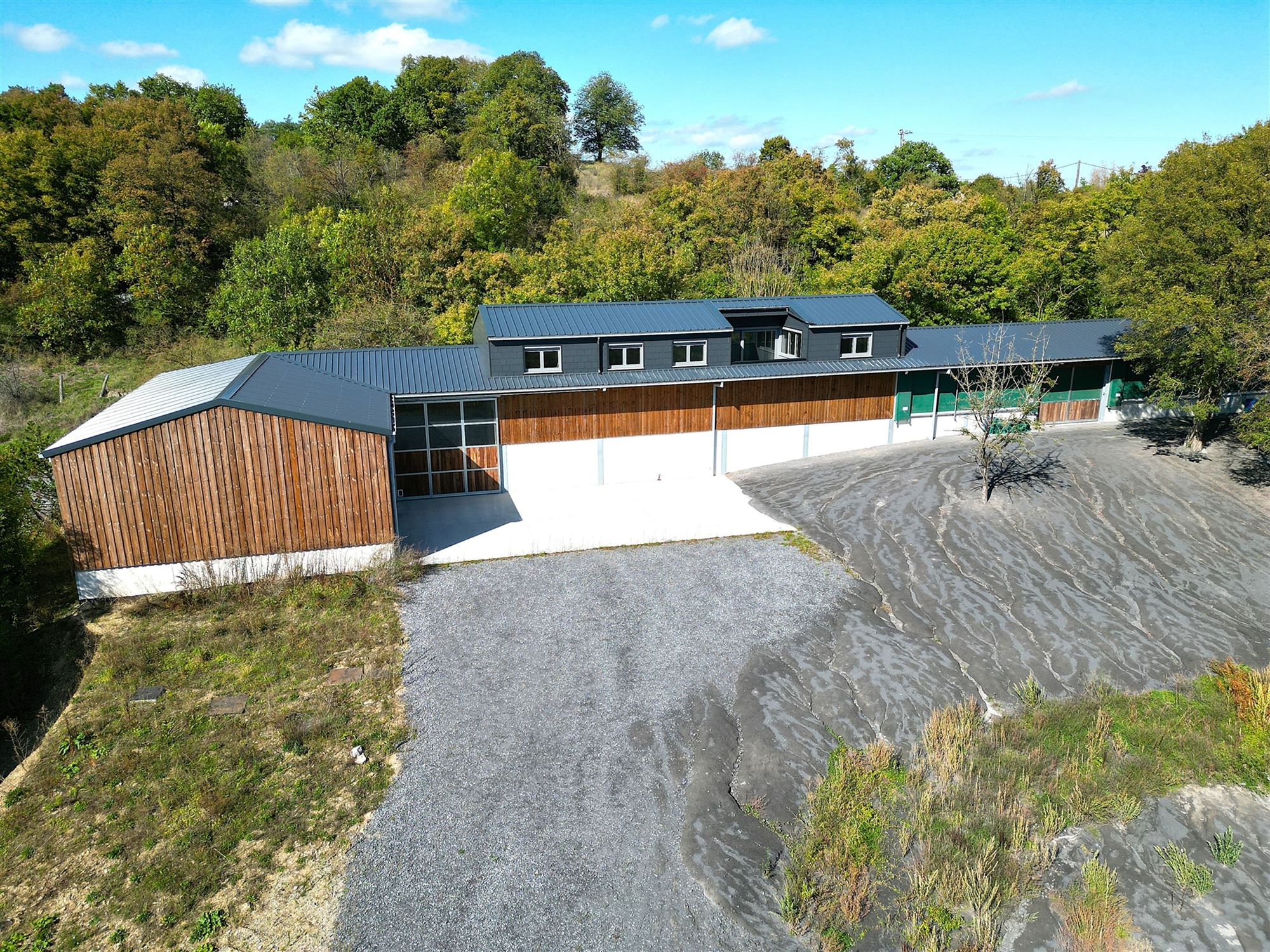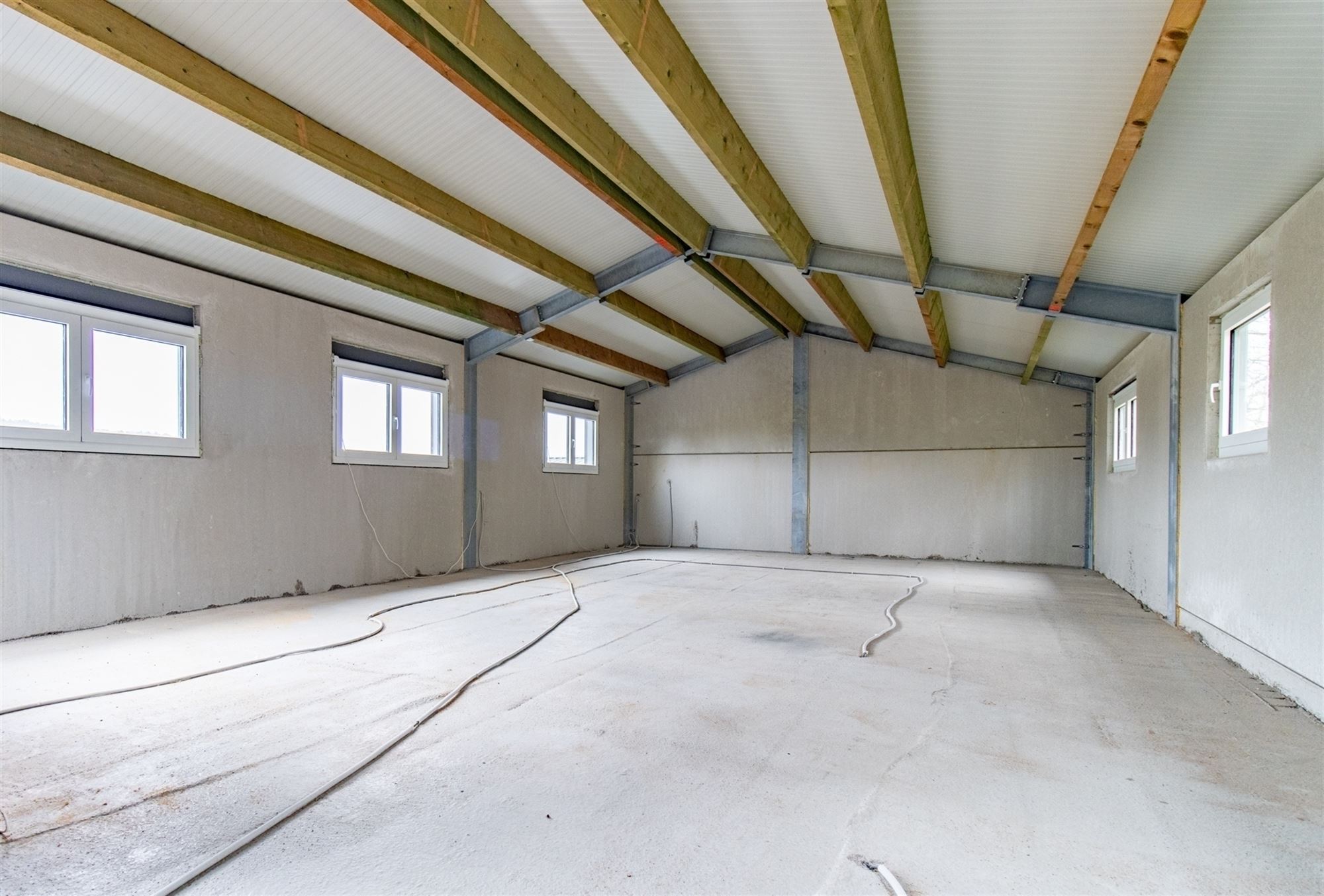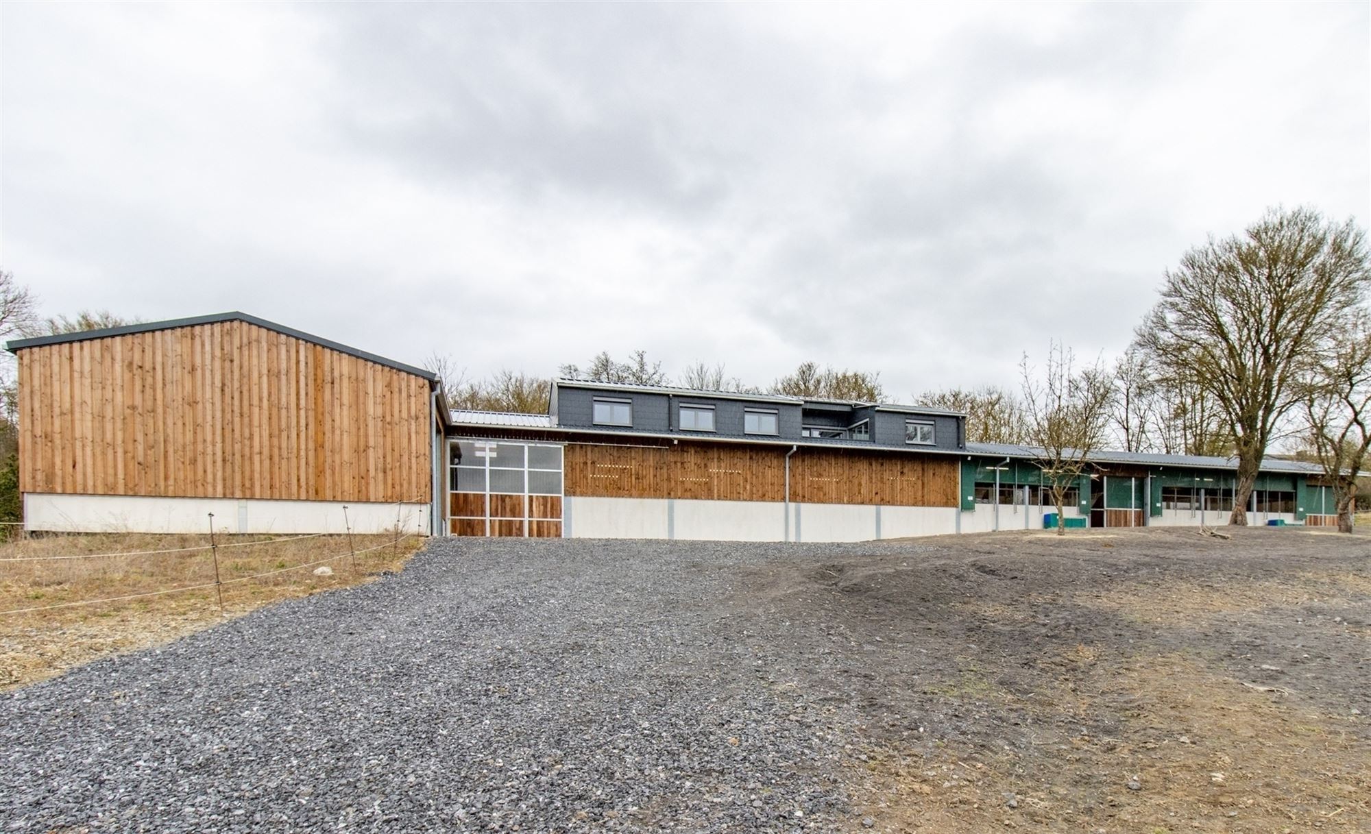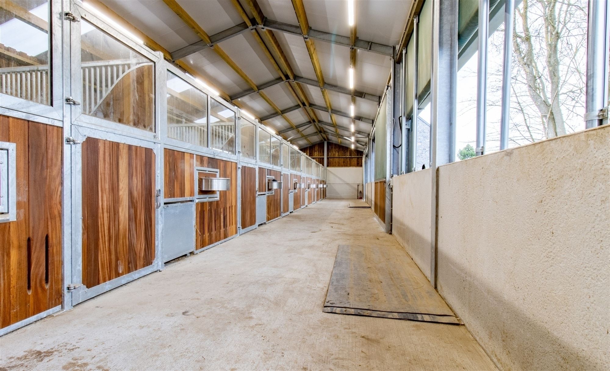 Hal met toegang tot het appartement links, opslagruimte/atelier en afzonderlijk toilet (nog te installeren), laadzone voor aanhangwagens (verhoogd voor comfortabel laden), opslagruimtes met een indrukwekkende hoogte (materialen, hooi, voertuigen … op 250 m²), over ongeveer 200 m²: brede gang voorzien van windbreek- en zonneschermen die momenteel 7 hoogwaardige boxen bedient.